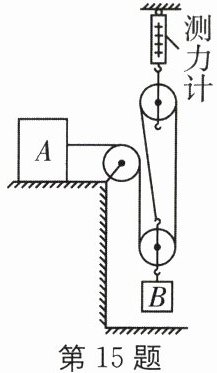 15. 如图所示,竖直固定的测力计下端挂一个滑轮组,已知每个滑轮重均为3 N,滑轮组下端挂有物体B,滑轮组绳的末端通过定滑轮沿水平方向与物体A相连,物体A在绳的水平拉力作用下向右做匀速直线运动,此时测力计的示数为15 N;在物体B下加挂重为9 N的物体C后,用水平向左的力F拉动物体A可使其沿水平桌面向左做匀速直线运动,此时物体B上升的速度大小为5 cm/s。若不计绳重及滑轮的摩擦,则下列说法正确的是( )