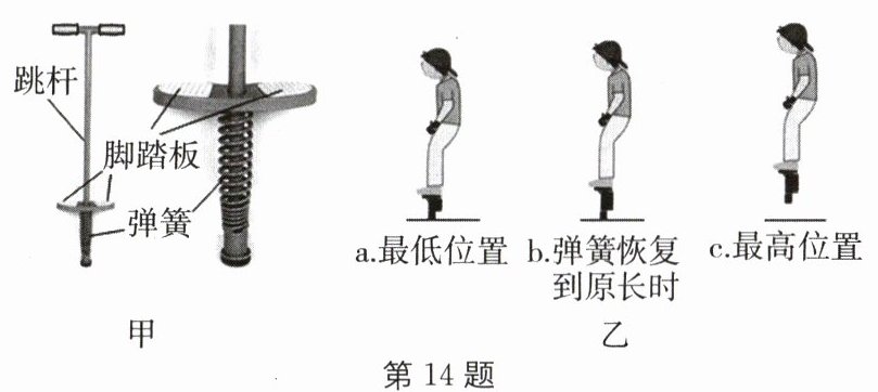 14. 弹跳杆运动是一项广受欢迎的运动。弹跳杆的结构如图甲所示,图乙是小宁玩弹跳杆时由最低位置上升到最高位置的过程,其中b是弹簧处在原长的状态,针对此过程分析正确的是( )