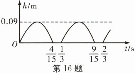 16. 跳绳是适合冬季的一种健身运动,旁人看起来似乎很简单,然而亲自跳起来就会感到运动量是相当大的。有位同学对此做了专门研究:跳绳者的质量m= 50 kg,跳绳者的重心高度随时间变化的情况如图所示。根据所给条件可估算出此跳绳者在1 min内共跳______次,共停留______s;他每跳一次克服重力做功为______J。(g取10 N/kg)
