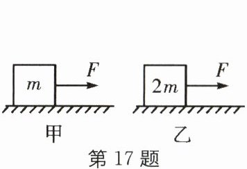17. 在甲、乙两图中,图甲地面粗糙,图乙地面光滑。质量分别为m、2m的两个物体在大小为F的恒力作用下,在力的方向上前进了相同的距离,则力F做的功W甲______W乙,F做功的平均功率P甲______P乙。(填“>”“<”或“=”)