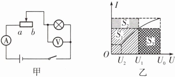 11. (2024·宁波一模)小科用如图所示电路测定小灯泡的电功率,将滑片从b移至a,记录多组数据并描绘出如图乙所示的I-U图像,若图中面积$S_1$表示灯泡两端电压为$U_1$时消耗的电功率大小,则此时滑动变阻器所消耗的电功率可表示为______( )