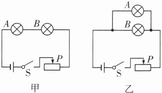 8. 在“探究电功率与电阻关系”时,实验准备了阻值分别为5 Ω、15 Ω的A、B两个同一类型的灯泡。同学们按图甲、图乙设计了两个实验电路进行探究。不考虑温度对灯丝电阻的影响,下列说法正确的是______( )