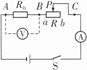 9. 如图所示电路,电源电压恒定,R₀为定值电阻,R为滑动变阻器(a、b为其两端点),电流表串联在电路中,另有一只电压表接在了A、B、C三接线点中的某两点之间。闭合开关S后,当滑片P移至某一端点时,电流表示数为0.4 A,电压表示数为8 V,再将滑片P移动至另一位置时,电流表示数为0.6 A,电压表示数为6 V。则下列说法正确的是( )