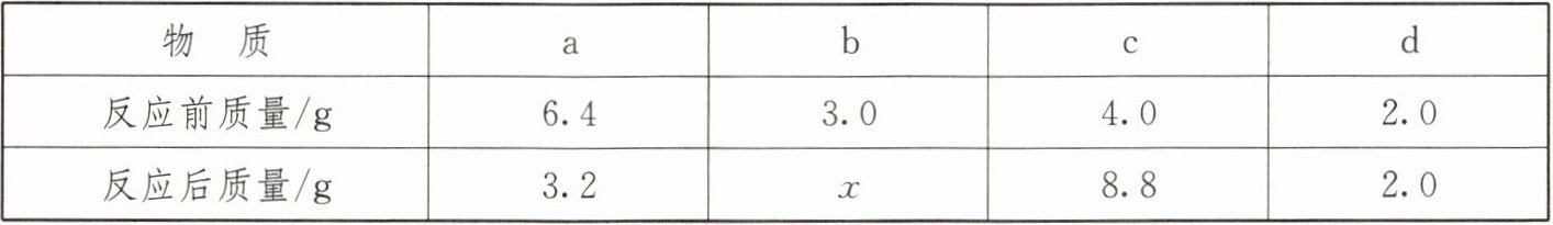 D.a、b反应的质量比为3.2g:1.6g=2:1。b完全反应消耗3.0g,设消耗a的质量为y,则2:1=y:3.0g,y=6.0g。a剩余质量:6.4g - 6.0g=0.4g,正确。
