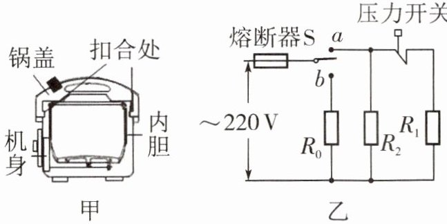 18. 图甲为某品牌电压力锅的结构示意图,图乙为其内部电路简图,图丙为煮饭时锅内压强随时间变化的曲线。其工作过程为:接通电源,启动智能开关S,S自动接a,同时压力开关自动闭合,电压力锅进入加热升压状态;当锅内压强达到180 kPa时,压力开关自动断开,进入保压状态,当锅内压强降至160 kPa时,压力开关又会自动闭合;当保压状态结束,煮饭完成,开关S自动接到b,进入保温状态。(已知$R_1$的规格为$“220 V 880 W”,R_2$的阻值为220 Ω,R₀的阻值为484 Ω。)
