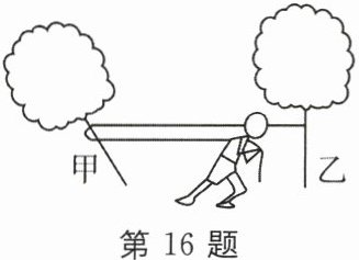 16. 小科想把被台风刮倒的树拉正。他把绳子的一端系在乙树上,然后绕过甲树用力拉绳子,这样做有____段绳子拉甲树。若不计绳重和摩擦,甲树受300 N拉力,则小科对绳子的拉力至少为____N。