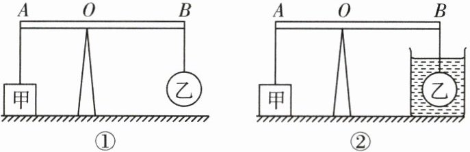 15. 用细线将体积均为$1000\ cm^3$的正方体甲和金属球乙分别悬挂在轻质杠杆AB的两端,$OA:OB= 2:3$,调节细线长度,使杠杆AB水平平衡,且甲静止在水平桌面上,乙球悬空,如图①所示。现将乙球浸没水中,杠杆AB仍保持水平平衡,如图②所示。下列分析正确的是( )