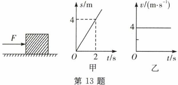 13. 物体在水平地面上做直线运动,当物体运动的路程和时间图像如图甲所示时,受到的水平推力为$F_{1}$;当物体运动的速度和时间图像如图乙所示时,受到的水平推力为$F_{2}$。两次推力的功率分别为$P_{1}$、$P_{2}$。则下列关系正确的是( )