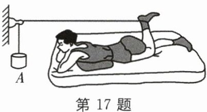17. 如图所示的健身运动的过程中,物体A的质量为4 kg,滑轮摩擦不计。当向下摆动脚腕使细绳拉着物体A缓慢(匀速)提升时,脚腕对细绳拉力的方向在改变,大小____(填“也改变”或“不变”)。若2 s内脚腕将物体A匀速提起0.4 m,则其对物体A所做的功为____J,功率为____W。(g取10 N/kg)