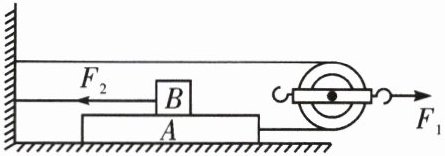 14. 用水平力$F_{1}$拉动如图所示的装置,使木板A在粗糙水平面上向右匀速运动,物块B在木板A上表面相对地面静止,连接B与竖直墙壁之间的水平绳的拉力大小为$F_{2}$。不计滑轮重和绳重,滑轮轴光滑。则$F_{1}与F_{2}$的大小关系是( )
