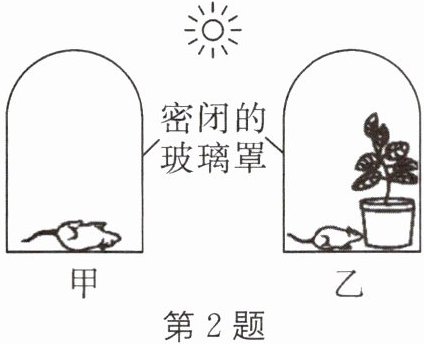 (2) 乙装置中小白鼠能正常活着是因为绿色植物的______作用,更新了玻璃罩内的气体。这种生理活动的表达式是______。