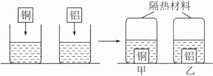 (2)取出后,将铜块、铝块再分别放入盛有质量相等、温度都是$23^{\circ}C$的水中,并将容器用隔热材料密封,如图所示。