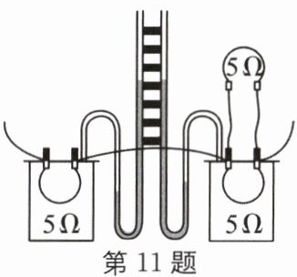 11. 如图的实验装置探究的是电流通过导体时产生热量的多少与______的关系。通电一段时间后,左右两侧密闭容器内的电阻产生的热量之比为______。