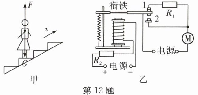 12. 手扶式电梯在商城中随处可见,小科在资料上看到这种电梯的功率只与转速有关,与电梯上的人数无关。于是许多商城为了省电把电梯设置成:无人时转动较慢,有人时转动较快。
