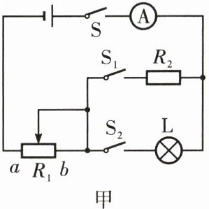 B.闭合S和$S_2,$断开$S_1,$滑片移到中点时,用一个“4 V 0.5 W”的灯泡L'替换L,则将正常发光