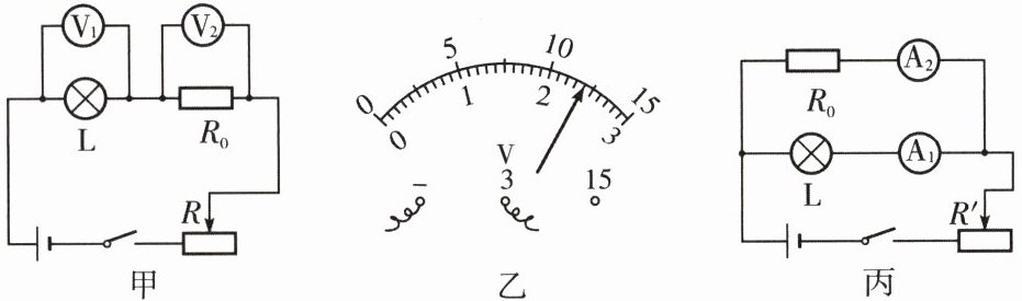 (2)他进一步设计出了只有电流表没有电压表来解决这个问题的方法,其电路如图丙所示,R₀= 5 Ω,其中关键的一步是必须调节滑动变阻器,使电流表$A_2$的示数为______A时,再读出电流表$A_1$的示数,才能计算小灯泡的额定功率。