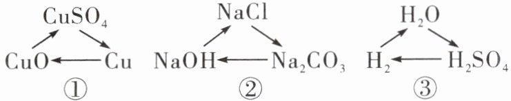 $① CuO←Cu→CuSO_4 ② NaCl←Na_2CO_3→NaOH ③ H_2O←H_2→H_2SO_4$