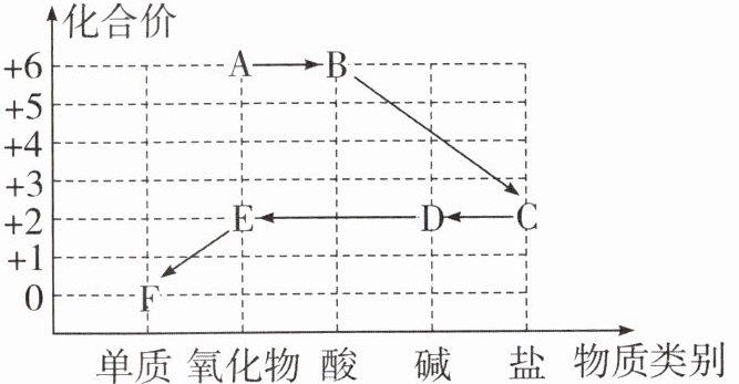 14. 小科以化合价为纵坐标、以物质类别为横坐标绘制了如图,每种物质中都有一种元素的化合价与纵坐标的数值对应,图中字母均表示初中科学中的常见物质,其中“A→B”表示物质间的转化关系。已知A为硫的氧化物且氧元素的质量分数为60%,C、D、E、F均含有铜元素。请回答: