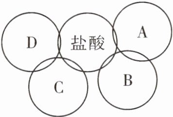 7. 如图所示,图中两环相交表示两者之间能相互反应。已知B是常见金属,它和C分别与稀盐酸反应均有气泡放出,C与D反应有沉淀生成。请你从氢氧化钙、铜片、稀硫酸、铁片、碳酸钠、硝酸银六种物质中选出符合要求的物质并回答下列问题。