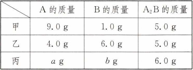 12. 金属单质A和非金属单质B可生成化合物${A2B}$,反应的化学方程式为${2A + B\xlongequal{\triangle} A2B}$。某校甲、乙、丙三位同学分别在实验室内做该实验,充分反应时,所用A和B的质量各不相同,但总质量相等,都是10.0g。有关实验数据记录如表所示。