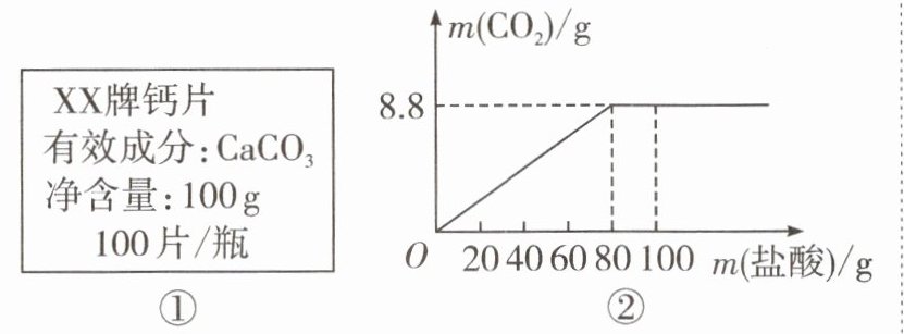 8. 钙是人体中的常量元素,因缺钙而导致骨质疏松、佝偻病等的患者应在医生的指导下服用钙片。某补钙药剂说明书的部分信息如图①所示。现将100 g盐酸分成五等份,逐次加到用40片该药剂制成的粉末中(其他成分不与盐酸反应),得到的部分数据与关系图如图②所示。