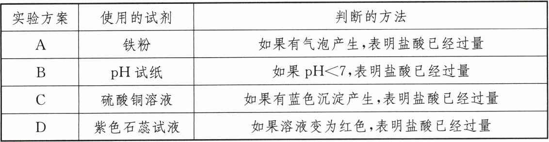 | C | 硫酸铜溶液 | 如果有蓝色沉淀产生,表明盐酸已经过量 |