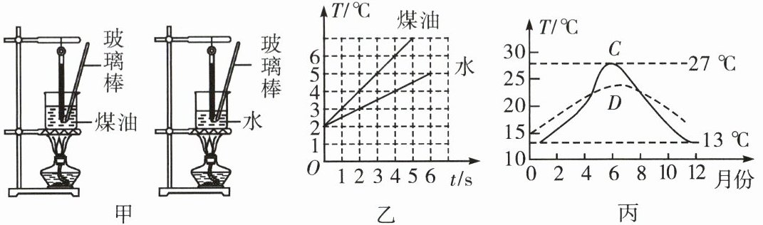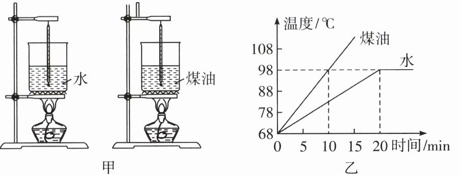 26. 小科用相同的酒精灯分别给水和煤油加热(如图甲所示),以探究水和煤油的吸热能力。