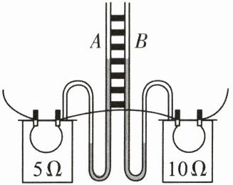 11.如图所示的实验装置可以用于探究电流通过导体产生的热量与什么因素有关。实验装置中,两根阻值不等的电阻丝$R_1(5Ω)、$$R_2(10Ω)$串联后分别放入两个透明容器中,两个容器各连接一个U形管,两U形管装有同样的液体并封闭等量的空气。通电前,两U形管内的各液面相平,通电后,通过$R_1、$$R_2$的电流分别为$I_1、$$I_2,$通电一段时间后,比较液面的高低,应是( )