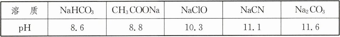 | 溶 质 | $\mathrm{NaHCO_3}$ | $\mathrm{CH_3COONa}$ | $\mathrm{NaClO}$ | $\mathrm{NaCN}$ | $\mathrm{Na_2CO_3}$ |