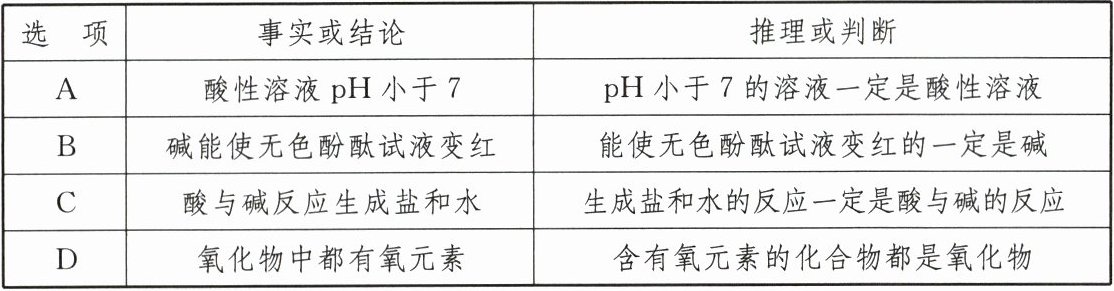 | B | 碱能使无色酚酞试液变红 | 能使无色酚酞试液变红的一定是碱 |