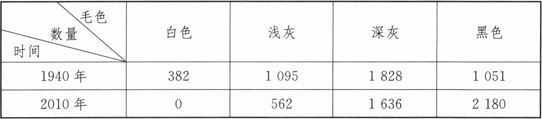 解:分析表格数据,1940年至2010年,白色兔数量从382变为0,浅灰兔数量减少,深灰兔数量略有减少,黑色兔数量显著增加。该生态系统中兔的毛色变化是自然环境对不同毛色变异个体选择的结果,适应环境的个体得以生存繁衍,不适应的被淘汰,这符合自然选择学说。人工选择是人类主动干预,题目未提及;变异是随机发生的,并非“为了适应环境”主动发生;白色污染与兔毛色变化无关。