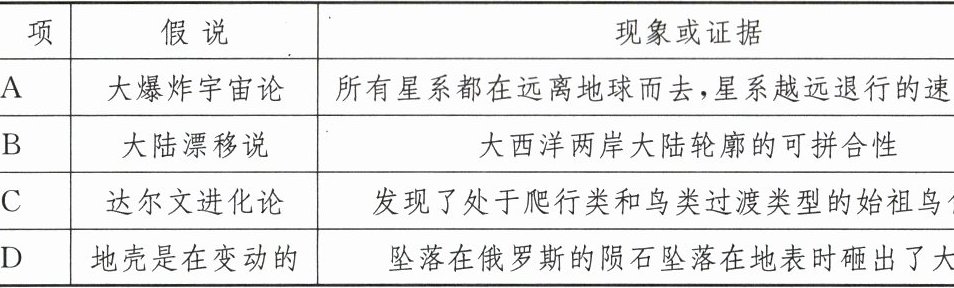 10. 科学假说在科学发现中起着重要作用,但需要相应的现象或证据支持。下列现象或证据不能支持对应假说的是( )