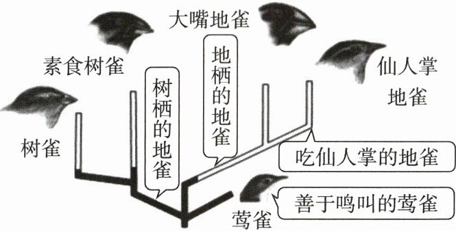 12. (2024·湖州模拟)加拉帕戈斯群岛的不同小岛上生活着喙型不同的地雀,其进化过程如图所示。下列叙述不符合达尔文进化论的是( )
