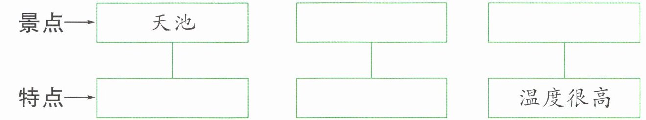 2. 短文介绍了长白山的哪些景点?它们有什么特点?填一填。