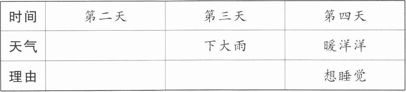 | 天气 | | 下大雨 | 暖洋洋的 |