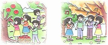 1. 示例:去果园摘苹果 在草地上唱歌 2. 示例:睡觉 树上唱歌 天空飞翔 草地上吃虫子