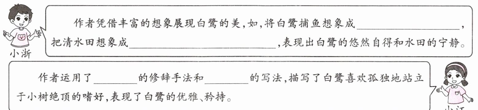 2. [写法探究]小浙和小江就"作者是如何表现白鹭在不同场景中的美"展开了讨论,请你补全对话。