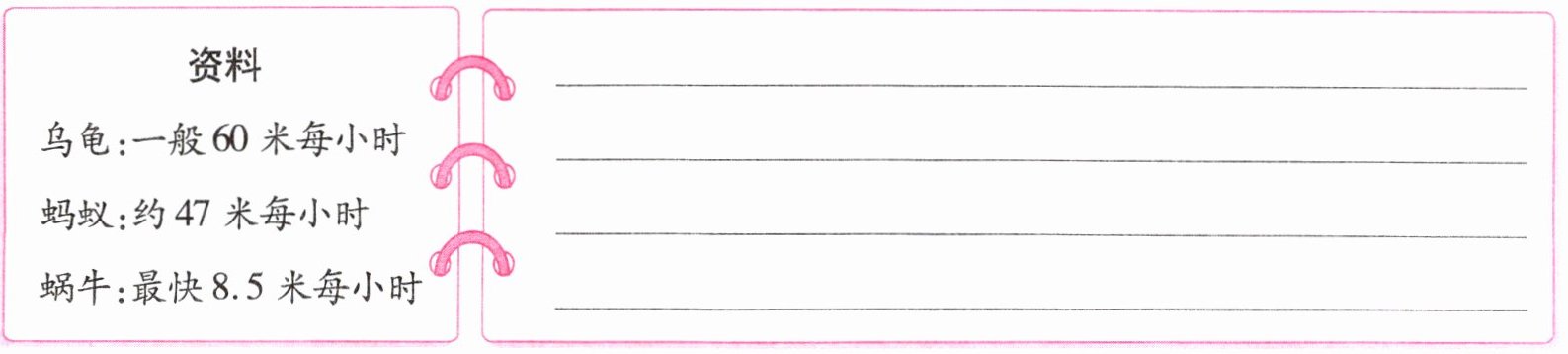 五 我们常把很慢的速度叫“龟速”。事实上,有许多动物比乌龟的速度慢得多。结合所给的资料,选取一种动物,仿照课文的写法,写一写什么比乌龟的速度更慢。