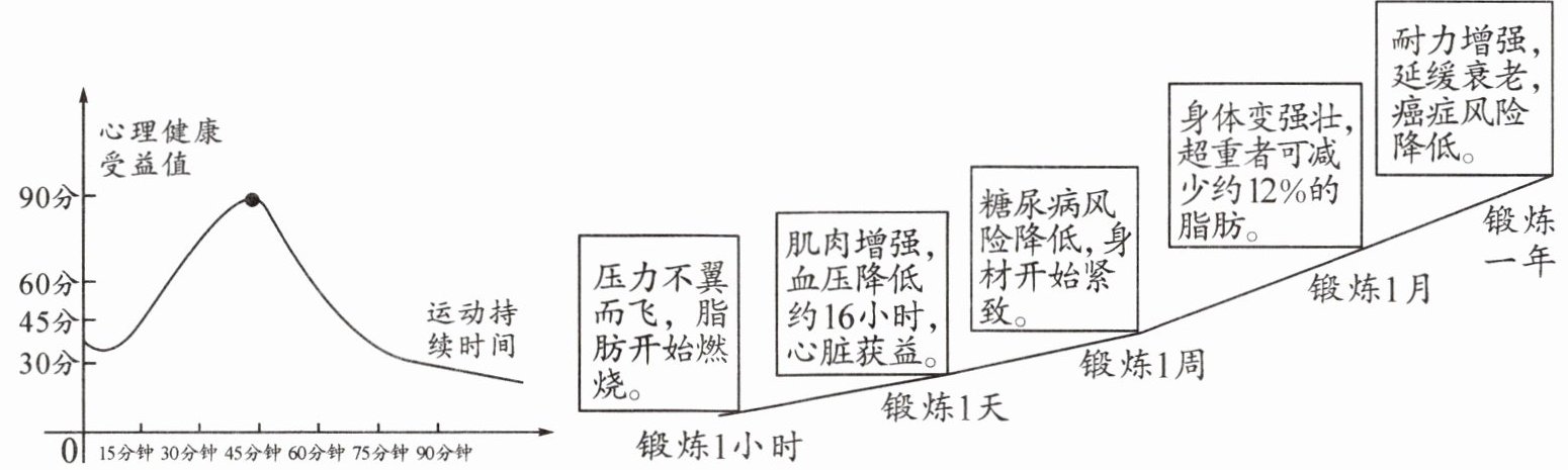 3.(1)√ (2)√ (3)× 4.示例:①运动可以提高注意力,让你在学习时更加专注,从而提高学习效率。②坚持锻炼可以增强身体素质,提高身体免疫力,让你更加健康。③参与社团活动可以结交新朋友,培养团队合作精神和积极心态。即使难以赢过别人,也可以从中获得乐趣和成长。综上所述,运动对身心都有益处,所以建设你还是继续参加“奔跑吧”社团吧!