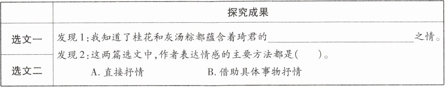 | 选文一 | 发现1:我知道了桂花和灰汤粽都蕴含着琦君的______之情。 |
