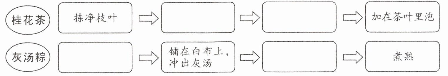1. [内容梳理]阅读选文,完成桂花茶和灰汤粽的制作流程。