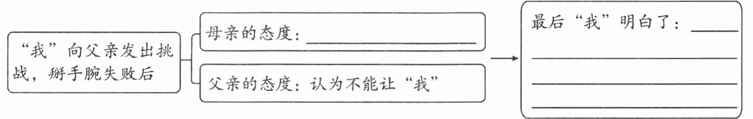 | “我”向父亲发出挑战,掰手腕失败后 | 母亲的态度:______ | 最后“我”明白了:______ |