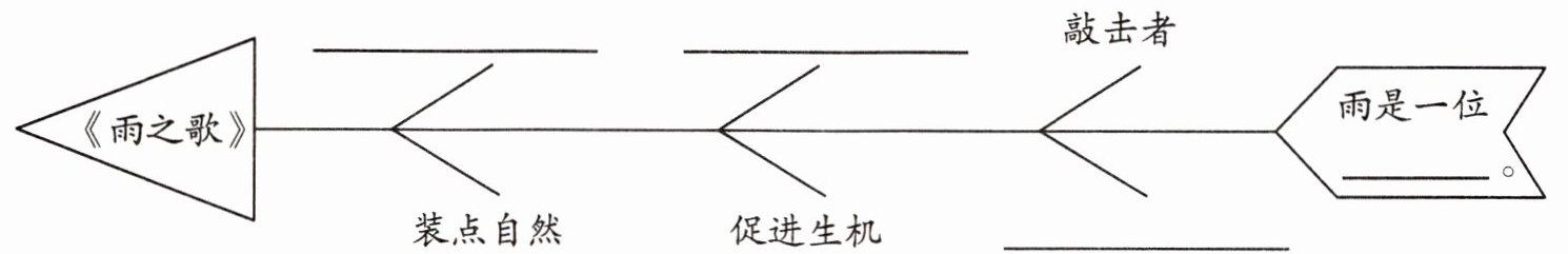 2. [语文要素]本文与《花之歌》一样都充满了丰富的想象,使用了多种修辞手法。文中画“____”的句子用排比、拟人化的手法写出了雨的不同______,同时又使用了______的修辞手法,生动形象地表现了诗人______的思想感情。