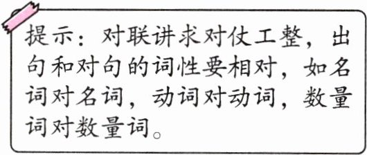 提示:对联讲求对仗工整,出句和对句的词性要相对,如名词对名词,动词对动词,数量词对数量词。