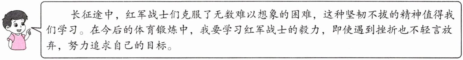 长征途中,红军战士们克服了无数难以想象的困难,这种坚韧不拔的精神值得我们学习。在今后的体育锻炼中,我要学习红军战士的毅力,即使遇到挫折也不轻言放弃,努力追求自己的目标。