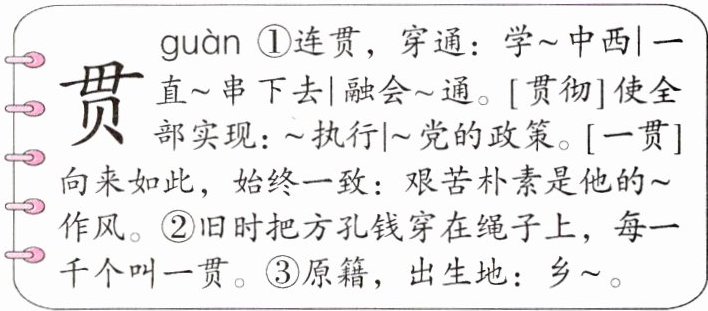 贯 guàn ①连贯,穿通:学~中西|一直~串下去|融会~通。[贯彻]使全部实现:~执行|~党的政策。[一贯]向来如此,始终一致:艰苦朴素是他的~作风。②旧时把方孔钱穿在绳子上,每一千个叫一贯。③原籍,出生地:乡~。