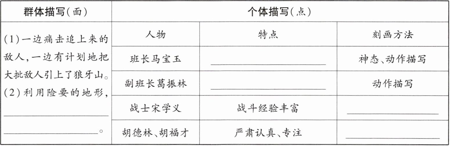 |(1)一边痛击追上来的敌人,一边有计划地把大批敌人引上了狼牙山。(2)利用险要的地形, 。|人物|特点|刻画方法|