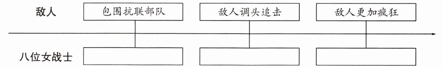 1. 向敌人射击 为避免被俘而下河 壮烈牺牲 2. D 3. 就在这时,几颗子弹突然飞了过来,王惠民向前倒了下去,冷云想去抱住她,却被一颗子弹打中了肩。胡秀芝将她扶住,冷云用手捂住伤口,安顺福抱住了王惠民。 她们忽而倒下,忽而又搀扶着站起,水流很深很急,但她们依然向着乌斯浑河的深处前行。 运用点面结合的手法,既有对八位女战士的整体描写,又有对八位女战士每个人的详细描写,既关注群体的英勇无畏,又通过对具体人物的动作描写,突显了她们视死如归的品质,使得故事更加感人。