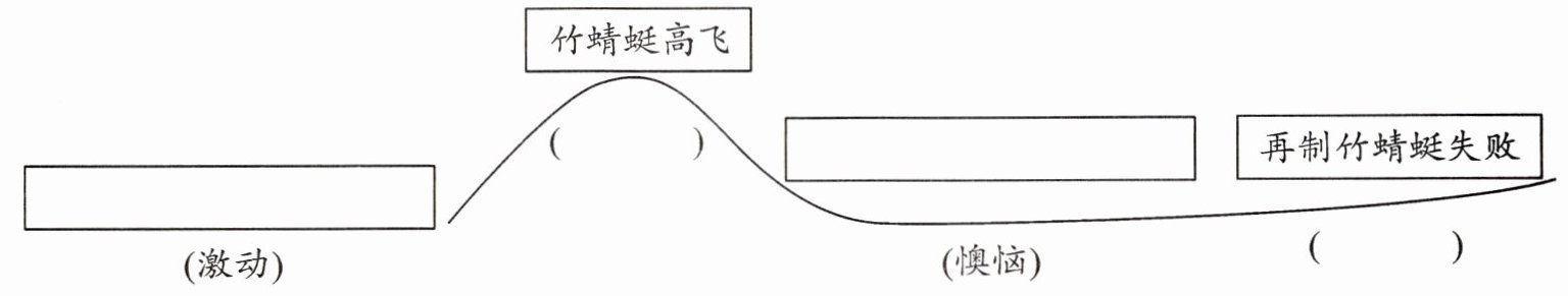 1.制成竹蜻蜓 兴奋 竹蜻蜓失踪 失落 2.①②③ ③ ③④⑤ 解析 本题考查整体感知的能力。完成本题首先要通读全文,大致了解每个段落的主要意思,再根据阅读任务,选择对应的阅读内容。第①②自然段写了制作竹蜻蜓的材料和过程,第③自然段写了“我”如何快乐地玩竹蜻蜓,因此要完成“竹蜻蜓制作和使用说明书”需要重点读这3个自然段;要完成任务“体会玩竹蜻蜓的快乐”需要重点阅读第③自然段。第③④⑤自然段写了“我”玩竹蜻蜓的始终,从中能体会到“我”心情的变化,因此要完成任务“探究作者是怎样把心情的变化过程写具体的”需要重点读这3个自然段。 3.A 4.主要体现在两个方面:一是成功制作竹蜻蜓的激动,二是看着竹蜻蜓飞上高空的兴奋。