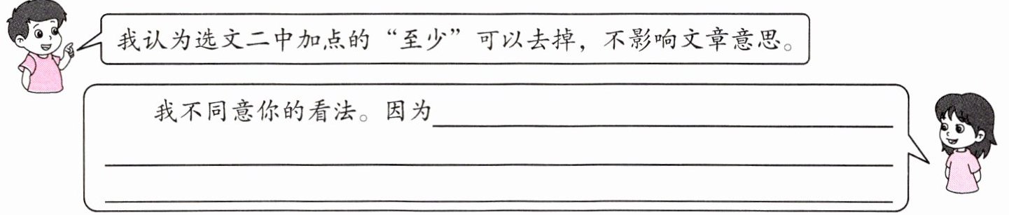3. [情境运用]读完选段二,同学们对"至少"一词能否删去产生了讨论,请你参与。
